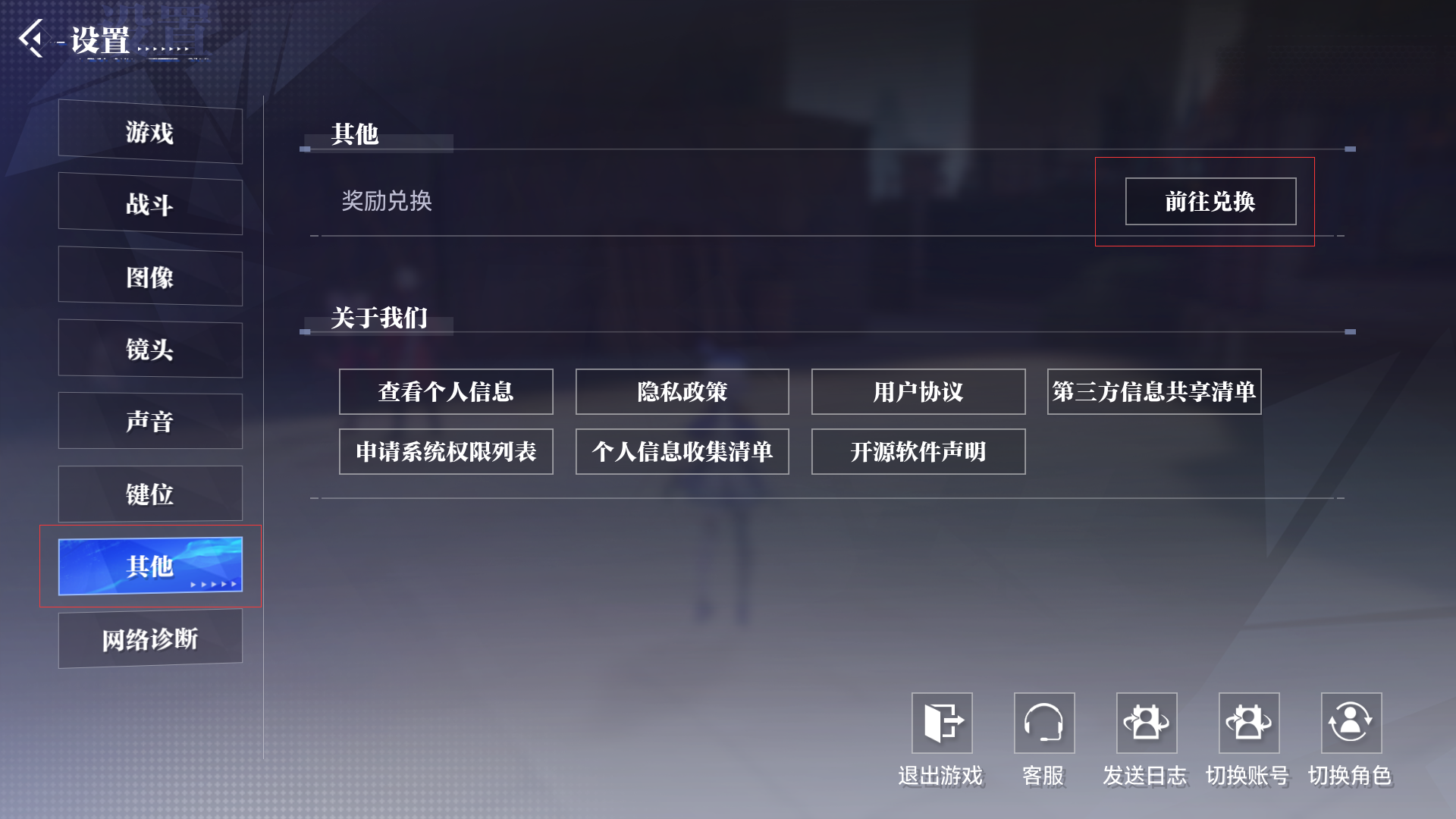 在设置界面右侧点击【其他】,即可跳转到奖励兑换界面;再点击【前往兑换】,输入获得的兑换码就可以兑换到丰厚奖励啦。