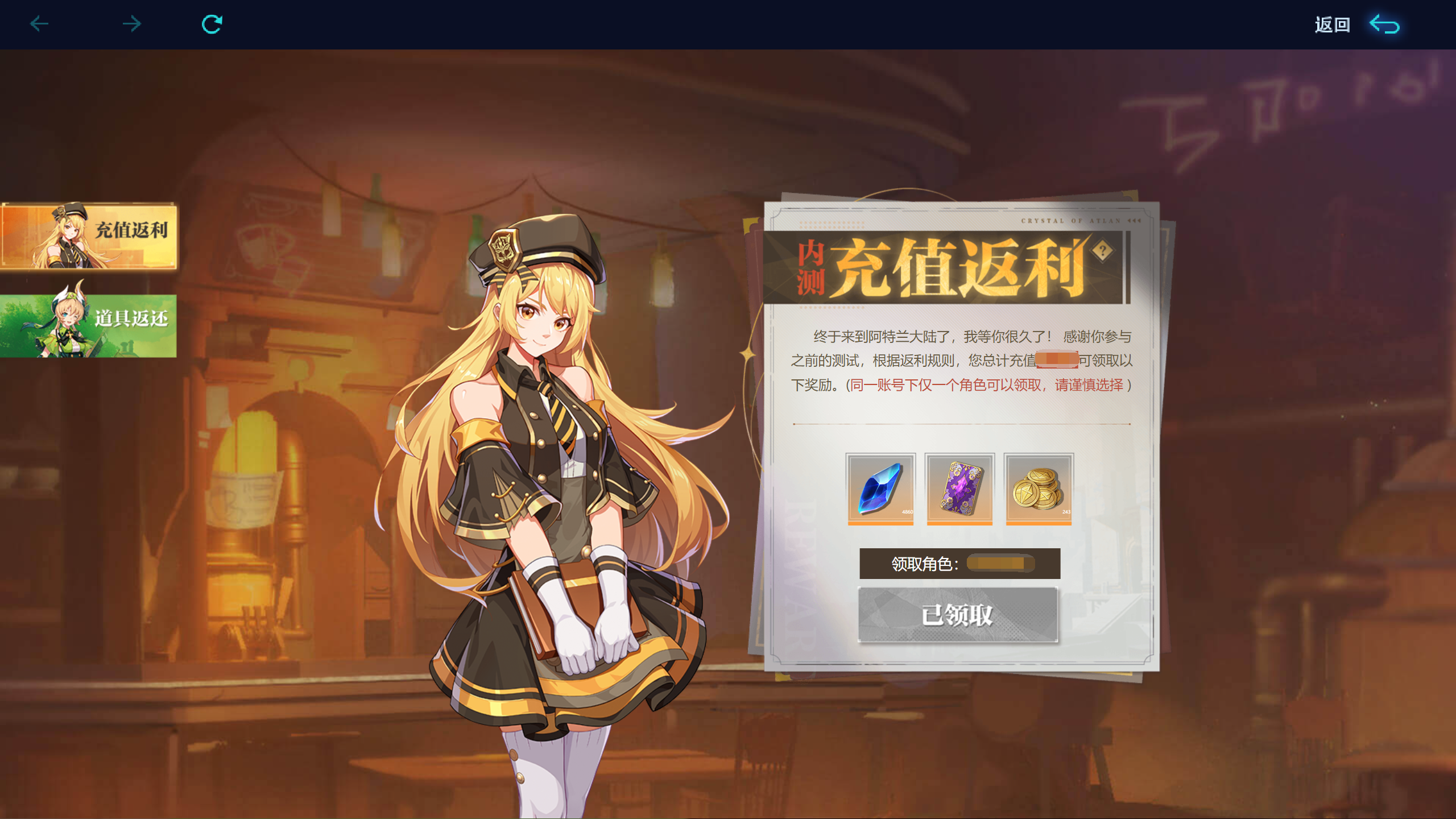 点击【立即前往】后即可跳转到内测充值返利活动中,领取充值返利奖励啦!