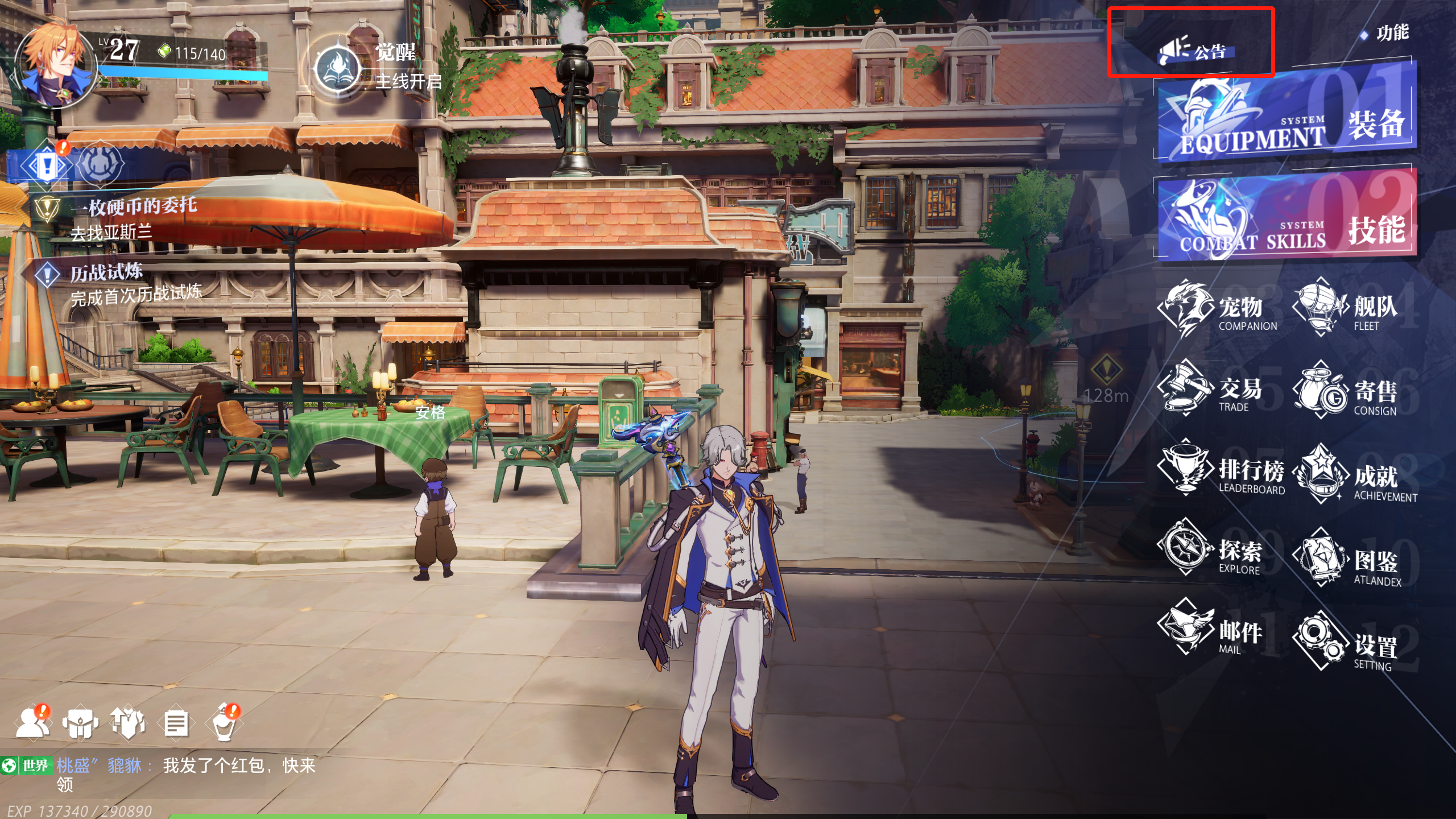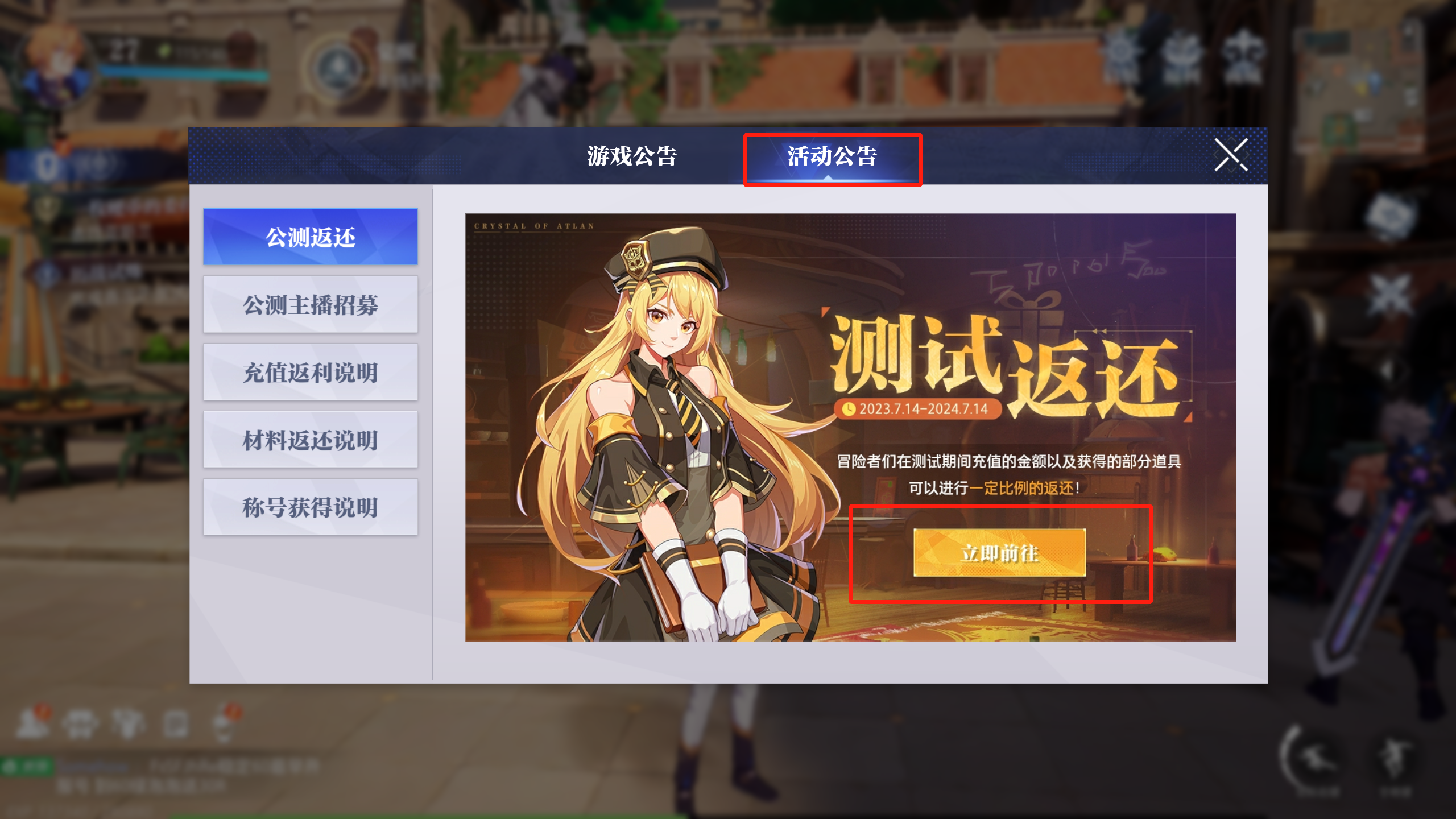 在游戏中,点击左侧【功能按钮】,冒险者们可以在公告里的【活动公告】中查询测试充值返利活动