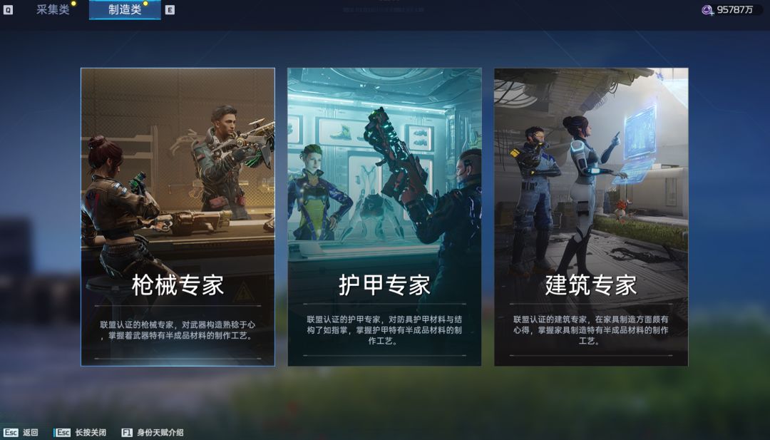 可选职业有:枪械专家、护甲专家、建筑专家,且同时只能认证一种身份(可重置,但再次重置需要7天CD)。