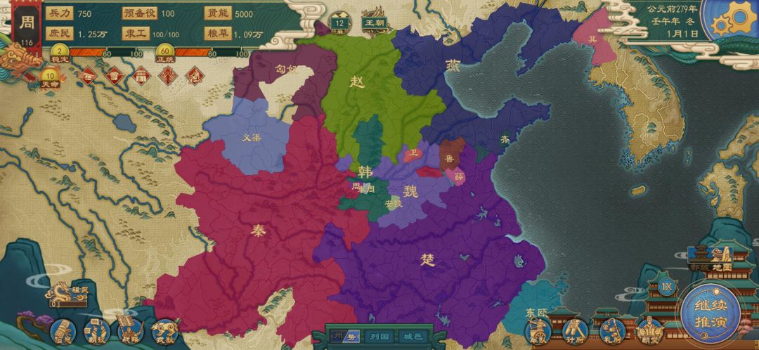 伐赵结束,获27城,陈兵燕国边境。宣他国边境叛军及小国准备上64城战国体量,61城过年。