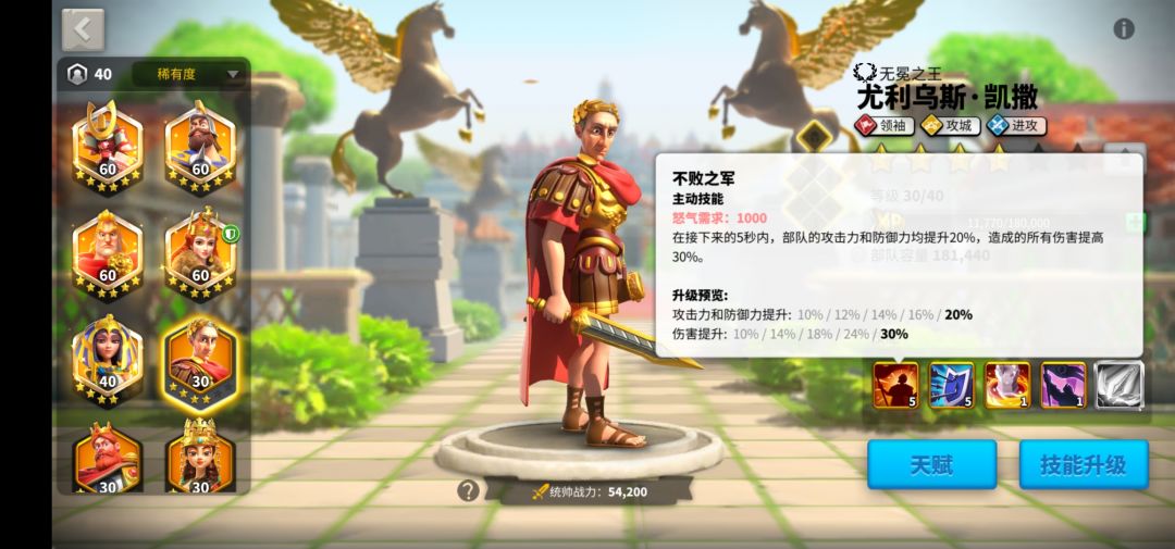 神圣尤利乌斯:给提供凯撒部队常驻的伤害减免,抵消对方造成伤害等,当血量下到60%技能效果将完全发挥,越是被围攻,技能触发概率越高。