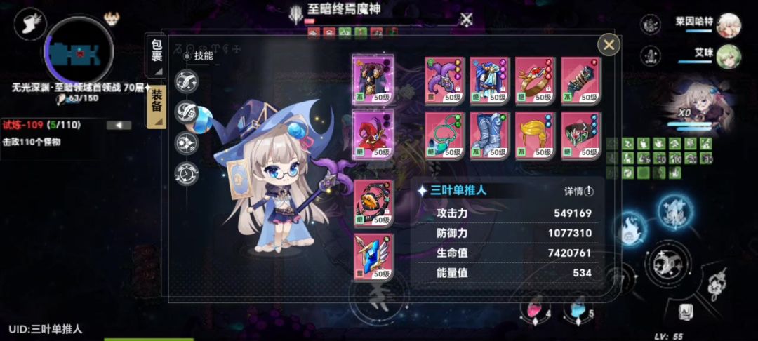 4.古达:170%技能伤害(大招150%),20%最终伤害,-25%怪物攻击力(不太好用,我古达给雅打助战后发现不够稳定覆盖率不够,用古达打到50层后就把他下了)
