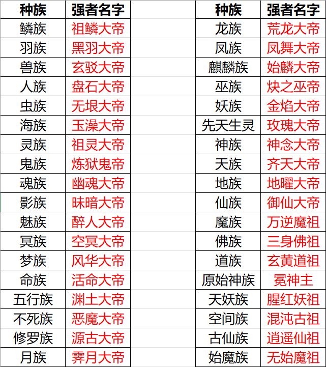 鳞族--xx 羽族--xx 兽族--xx 人族--xx 虫族--xx 海族--xx 灵族--xx 鬼族--xx 魂族--xx 影族--xx 魅族--xx 冥族--xx 梦族--xx 命族--xx 五行族--xx 不死族--xx 修罗族--xx 月族--xx 龙族--xx 凤族--xx 麒麟族--xx 巫族--xx 妖族--xx 先天生灵--xx 神族--xx 天族--xx 地族--xx 仙族--xx 魔族--xx 佛族--xx 道族--xx 原始神族--xx 天妖族--xx 空间族--xx 古仙族--xx 始魔族--xx