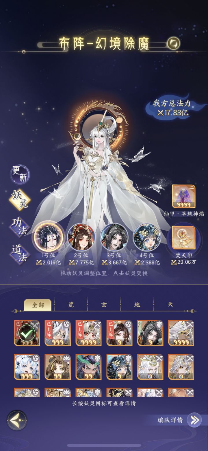 二.装备选择,这个简单,主C破法套拉满,再给副c破法,然后一套长生,一套御天。主角看情况,四长生二御天,或者纯御天。装备要注意的是看下上阵妖灵的法宝缘分,这个激活了➕百分之五的属性。