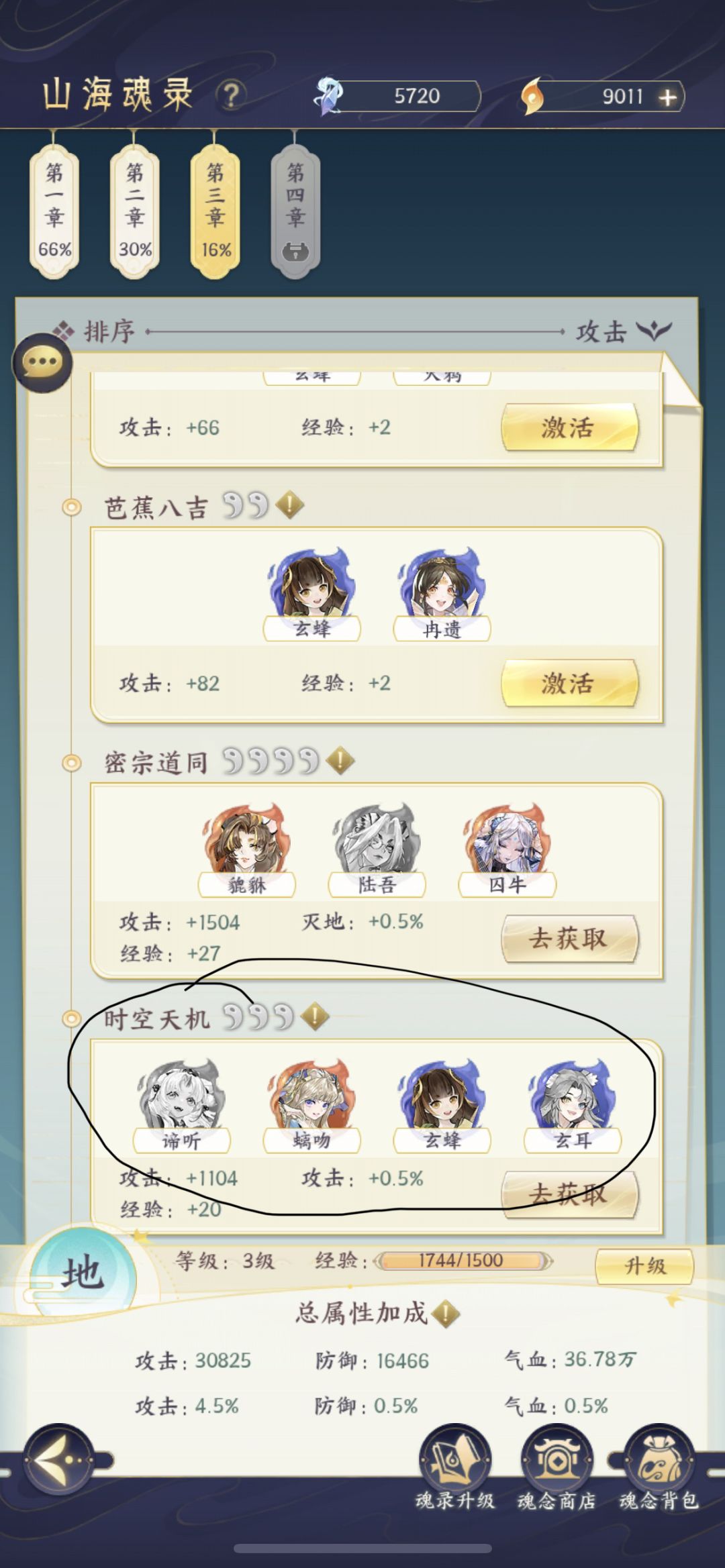 2.魂念别有就升,注意优先升级攻击百分比和固定攻击组合,右上角有个筛选可以选攻击。这游戏攻击优先级很高,极限过本你可以赌闪避招架和玉如意回血,但是攻击不够阈值就是刮痧,同样的还有本源炼星先升破法。