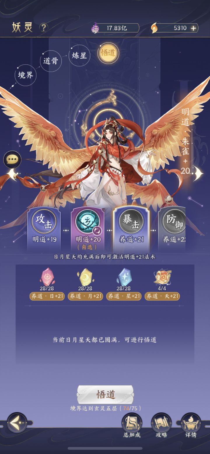 1.不要均养,不要均养,不要均养,前期认准一个大爹就是朱雀,所有资源对给就对了。什么算极限呢,就是你的悟道和道骨都因为等级卡了升不上去了像图里那样。