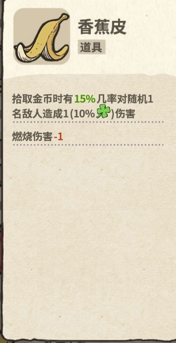 思路:利用天赋高幸运配合道具香蕉皮/多米诺骨牌,拾取金币就会造成伤害的原理,击杀怪成功后就可以无限自动伤敌通关。