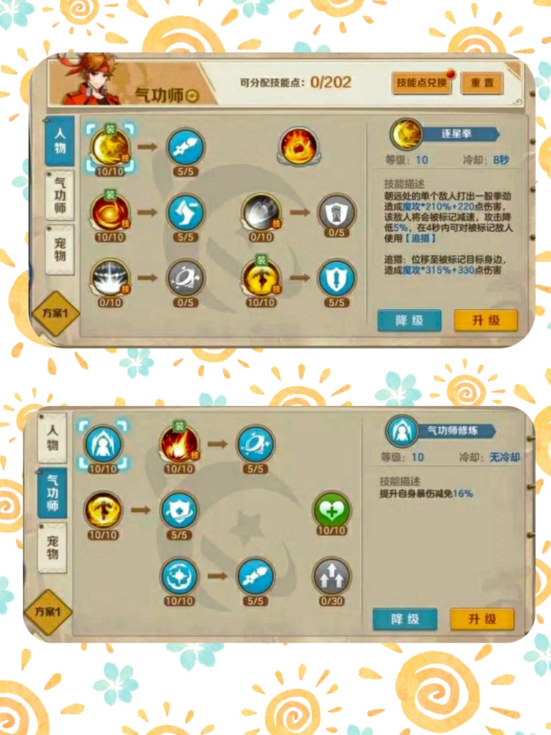逐星拳,气功师输出技能,受被动技能念力外放的影响,追猎功能取消,附带高额减攻和标记减速异常状态。