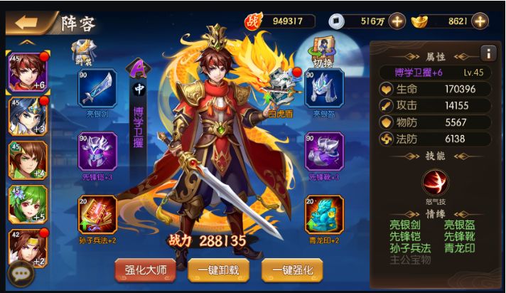 后期推荐玩蜀国阵容 蜀国里的英雄都非常的强力,但缺点是消耗的资源比较多,不过小编还是把常见的蜀国大佬阵容发下面,喜欢的小伙伴可以试着培养。 主角+赵云+关羽+张飞+刘备 主角+赵云+刘备+黄月英+关羽
