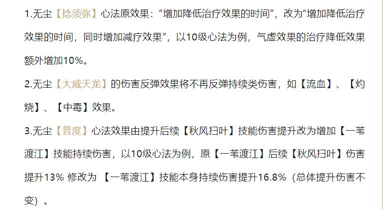 首先是和尚,给心法加了个10%减疗效果,应该是为了针对奶妈,我觉得挺好的,现在奶妈pk有点太强势了。然后大威天龙不能再反持续伤害,影响不大,持续伤害本身数值就低,反弹收益不明显,不过,听说新门派星宿很快要出了,大概率持续输出很猛,所以这波改动是为星宿铺路??最后普度的伤害调整,只是换了个技能强化,伤害不变。这波改动和尚也就pvp变强了一点点,总体没什么变化。
