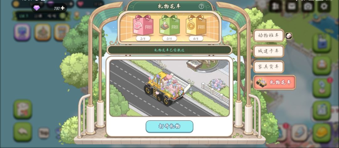 10.礼物花车礼物花车可以获得三种礼盒,但是每种一天都是有限制的。最开始打开礼物是有三种选择的,如果动物碎片是SR就选动物,然后看装饰喜不喜欢,喜欢的话就选装饰,不喜欢的话就选钱。