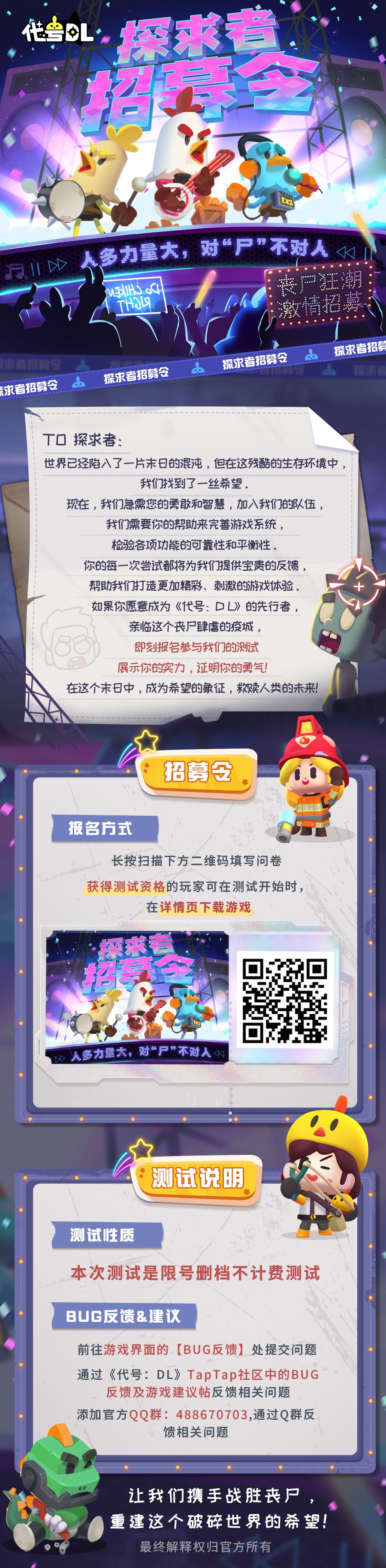 《代号DL》的测试资格招募问卷已经开启一段时间啦,还没有及时报名参与的幸存者们快快看过来哟,招募问卷将于7月20日23:59结束,招募结束后将会公布被抽中的测试玩家名单,还没报名招募测试的幸存者们赶紧上车叭!