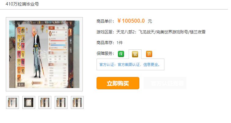 完美官方的寻宝天行,一点进去就能看到一个价格目前挂的最高的大佬账号,标题410万功力的账号,我心里一阵嘀咕,我滴个乖乖诶~这号是我目前见到功力最高的一个号了,我所在的区服,最高功力也才370W,38区这么叼的嘛,这得是充了多少啊!