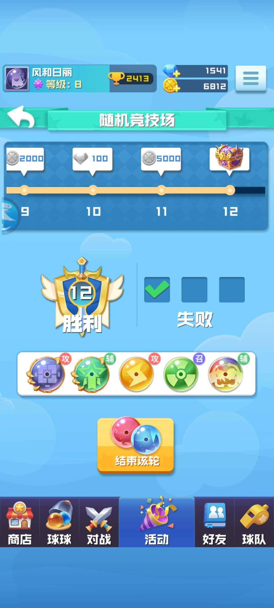 随机竞技场门票为100钻,很多球宝都比较心疼,但是只要掌握了随机竞技场的选球思路和打法思路,正常能做到永动机(7胜),运气好点12胜也比较简单,总结一下12胜的奖励,大约10000金币,200钻石,1个橙色球+5胜和8胜的两个箱子大几率出橙球(亲测,几率应该在30%左右)。
