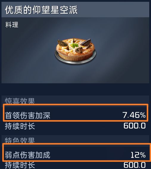 ①仰望星空派——鱼类*1+肉类*1+水类*1+小麦*1,触发惊喜效果的优质料理将同时有首领伤害加深、弱点伤害加成的效果;其他推荐: