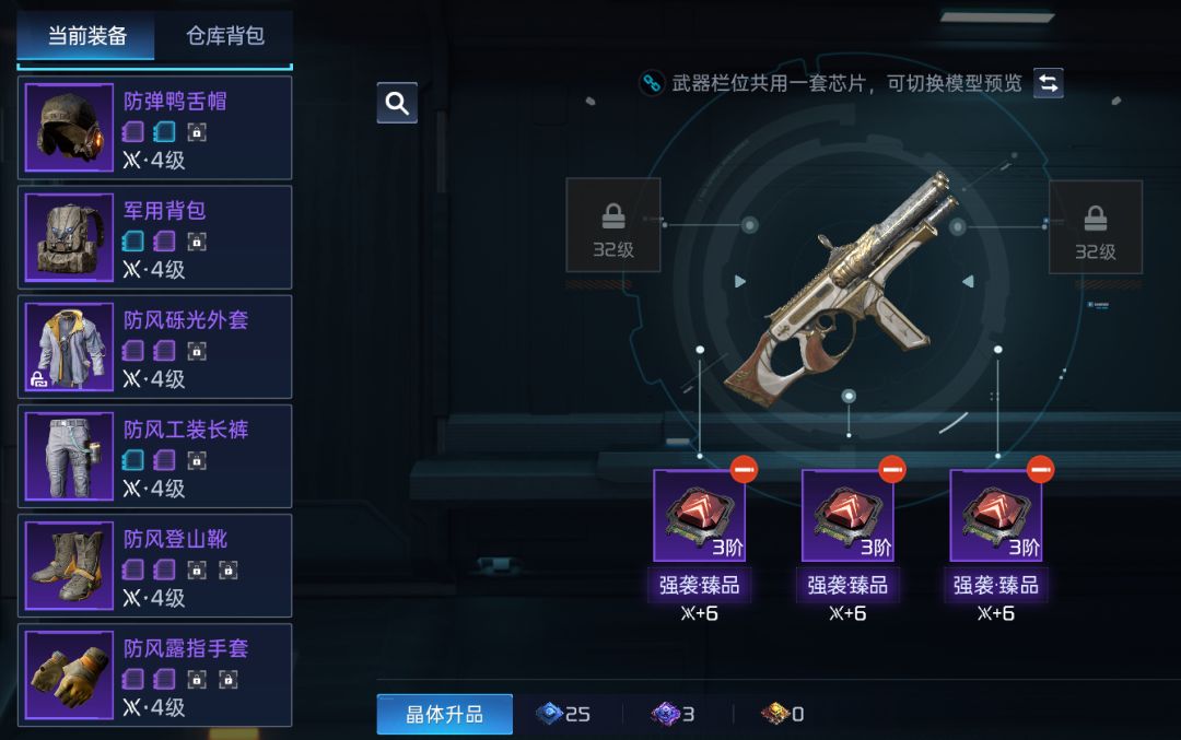 ●芯片:此号没有安装金芯片,全身蓝+紫就够用,注意武器、手套、鞋子务必带紫色攻击/火系强化即可;