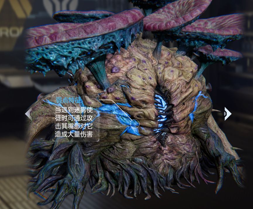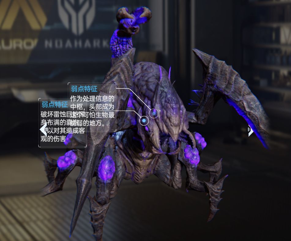 弱点部位:头部、身体各部位囊泡元素抗性:电系>火系=冰系>酸系(抗性越高,意味着使用该武器赋能对BOSS造成的伤害越低)
