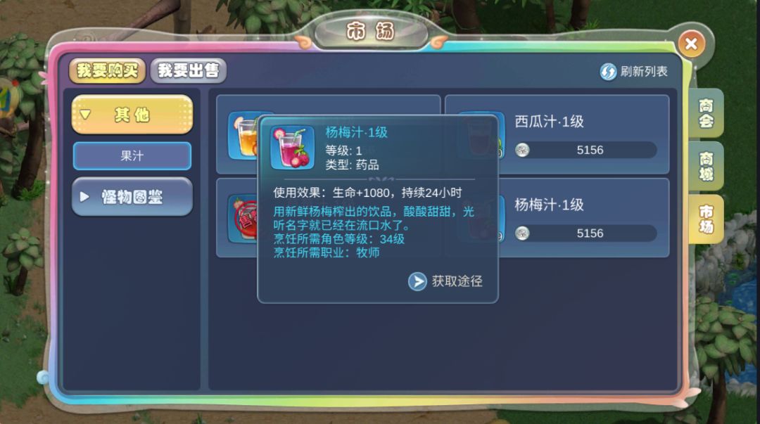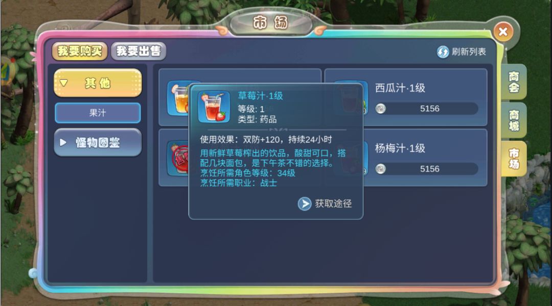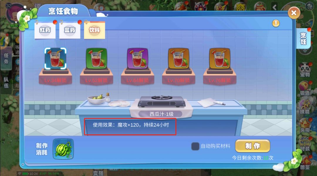 饮料是加物攻和伤害的,但是都只有24小时的持续时间,并且每天只有十次制作饮料的机会。饮料分为苹果汁、草莓汁、西瓜汁、杨梅汁这四种,每种饮料也是有不同等级划分的,更高等级的饮料有更好的加成效果。