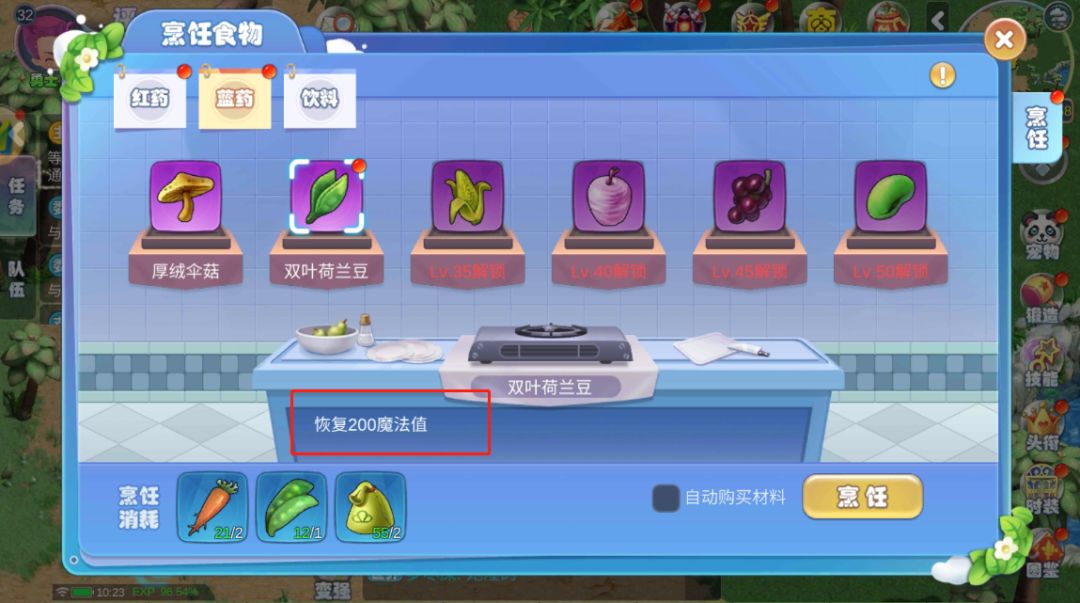 蓝药是恢复魔法值的,有厚绒伞菇、双叶荷兰豆、青黄玉米、软糖苹果、紫葡萄、元绿菜豆这六种。