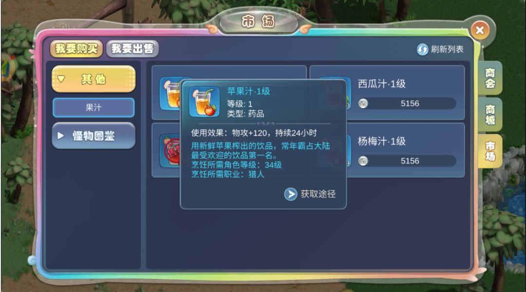 这个游戏最新颖有意思的地方就是每个职业都有自己的独属饮料,苹果汁是猎人独属的: