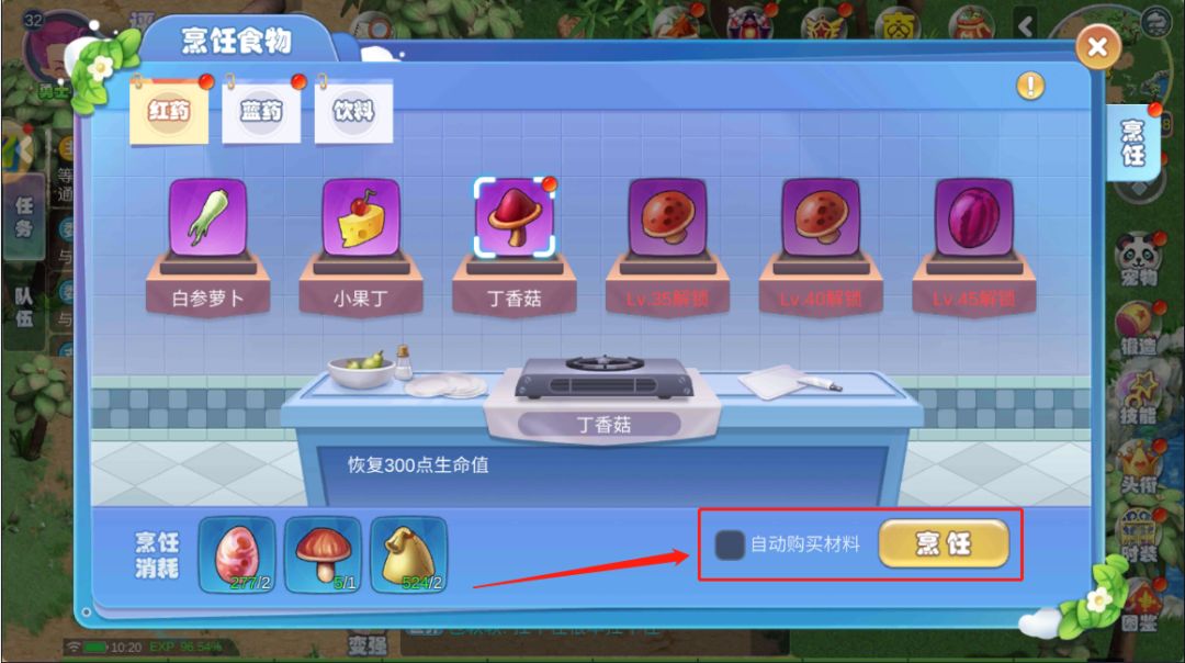 在生活系统里可以烹饪食物,但是呢,这个烹饪食物并没有我们日常烹饪那么详细,我们只需要准备好足够的食材,进入烹饪系统,点击烹饪就可以得到我们所需的食物啦。当然也可以自动购买材料,具体就看各人喜爱啦。