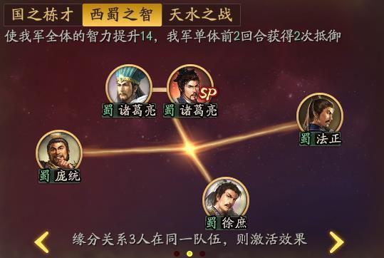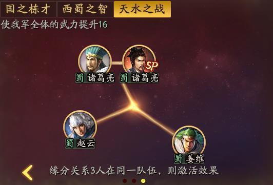 与诸葛亮有关的缘分关系一共有3个,分别是国栋之才、西蜀之智和天水之战,出镜率比较高了。
