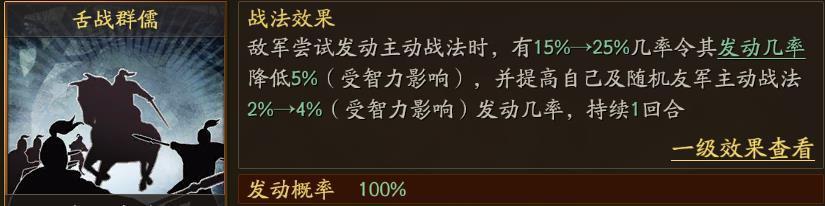 传承战法舌战群儒被光荣评为三战十大垃圾战法之一,最高25%的几率令敌军主动战法发动率降低5%,同时提高自己和一名队友主动战法发动率4%,即便受智力加成影响也好不到哪去,毕竟25%就等于告诉你这就是个废物点心,花一张诸葛换这个实在不划算,玩了这么长时间就从来没见人用过,也许后期策划会做平衡性调整吧,等着提高了咱们再议!