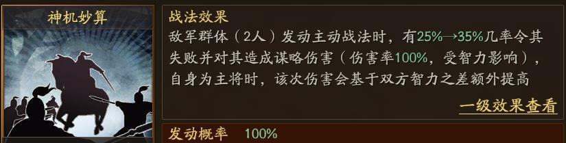 诸葛亮的自带战法神机妙算是100%发动的指挥战法,它的特色如果用两个字来形容,那就是网友常常提及的“打断”。打断对方武将2人所有的主动战法,概率是35%触发。之前我就说过这就是个概率游戏,挂着100%的外衣,实际上只有三分之一多的触控面积。神机妙算这一点类似计穷,另外还能制造谋略伤害,做主将时还有智力差效果。