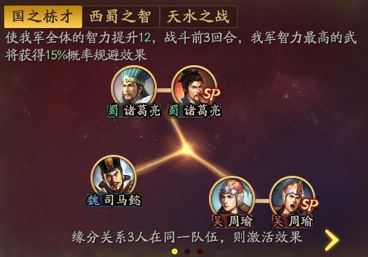 国栋之才是由魏蜀吴三国里的三名杰出代表诸葛亮、周瑜、司马懿组成的,效果是提升全体12点智力,前三回合智力最高武将获得15%的规避。总的看效果是不错,玩法上最好搭配的就是弓兵队伍,但是占用三个核心武将强凑缘分,多少有些不太划算,玩得比较少。