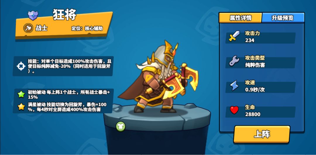 满星上阵5战士时,增加敌方伤害纯粹减免,可应对同类型战士阵容,跟狂将进行搭配,避免控制系英雄进一养成狂将!