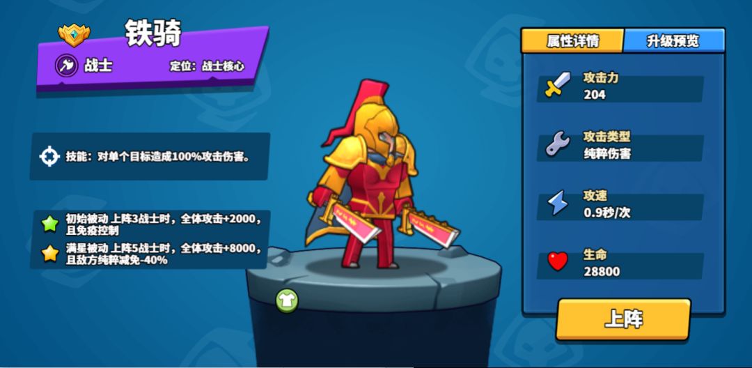 铁骑为战士中的核心,上阵3战士时,被动增加全体战士的攻击力,且附带免疫控制可以轻松应对海妖、萌萌等英雄;