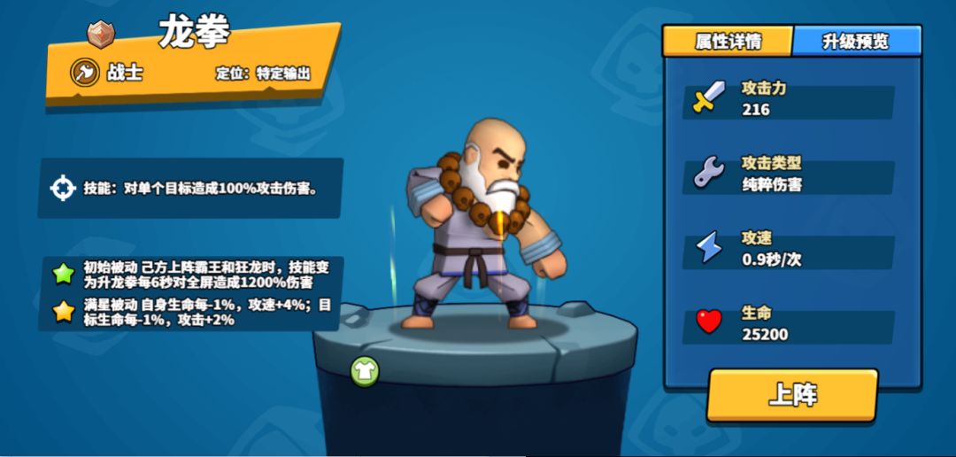 龙拳作为战士中的特定输出,最大的特点就是与霸王&狂龙一起组合上阵时,可以解锁升龙拳造成全屏1200%的伤害,加上狂将的职业加暴击可造就巨量暴伤!