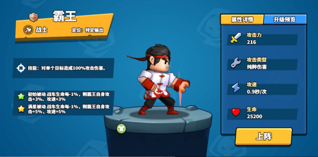霸王作为战士中的特定输出,技能特性是战车的生命值减少,则攻击力和攻速都会进行相对应的增加,加上狂将的加成辅助,在兵临红色血量的时候,往往可以力挽狂澜,扭转战局。