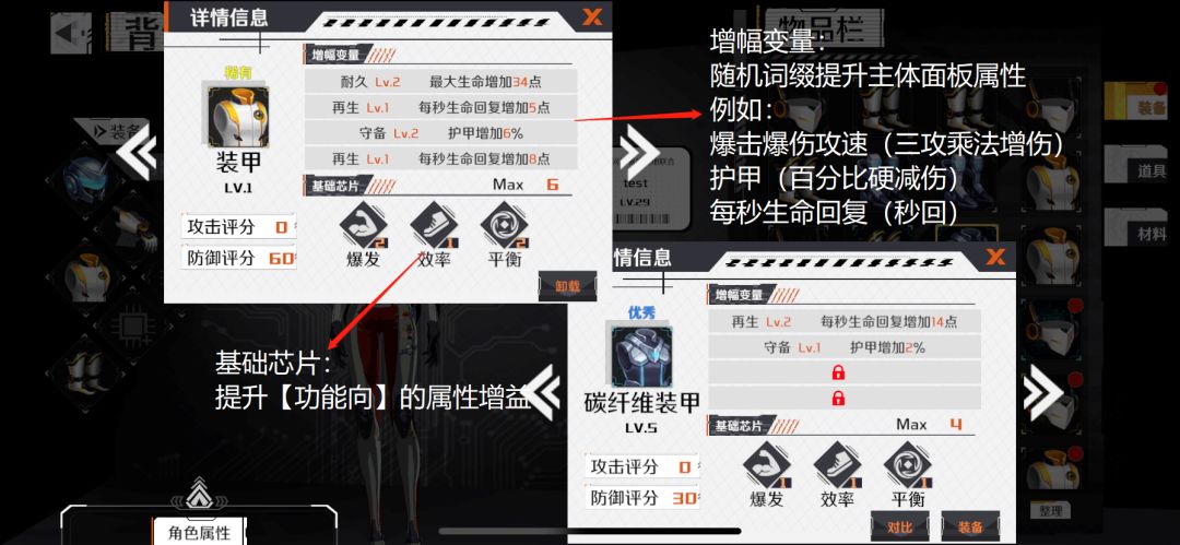 装备是没有任何强化、升星、镶嵌或插槽系统的,且所有的【增幅变量】与【基础芯片】均可以在【驱动装甲协调仪】内,通过消耗战斗中掉落的素材进行修正。