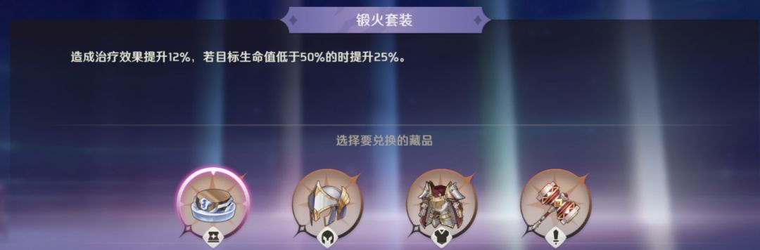 游戏前期个人认为最适合安莉的私藏品为【煅火】,三件套就可以触发效果,造成的治疗效果提升12%,目标生命低于50%时提升25%。这个套装可以说是奶妈专属不为过,属性选择生命值为主,毕竟安莉治疗效果是以自己生命值上限为标准。速度为辅,因为安莉的被动效果,推荐速度快点为主,最好为一速,可以让队友吃到攻击加成,实在不行也要比对面快 有几率让对面吃到眩晕。