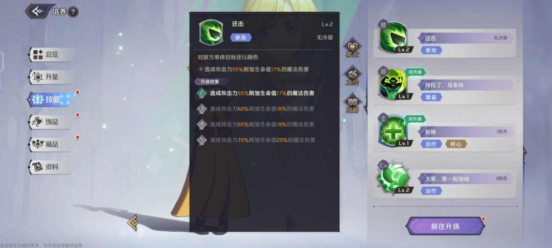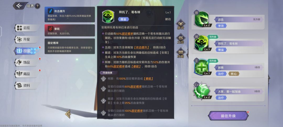 升级至2级柯耶眩晕概率提升100%,4级戴诺恢复血量提升到35%,3级80%概率召唤哥布林提升至5级到100%概率。