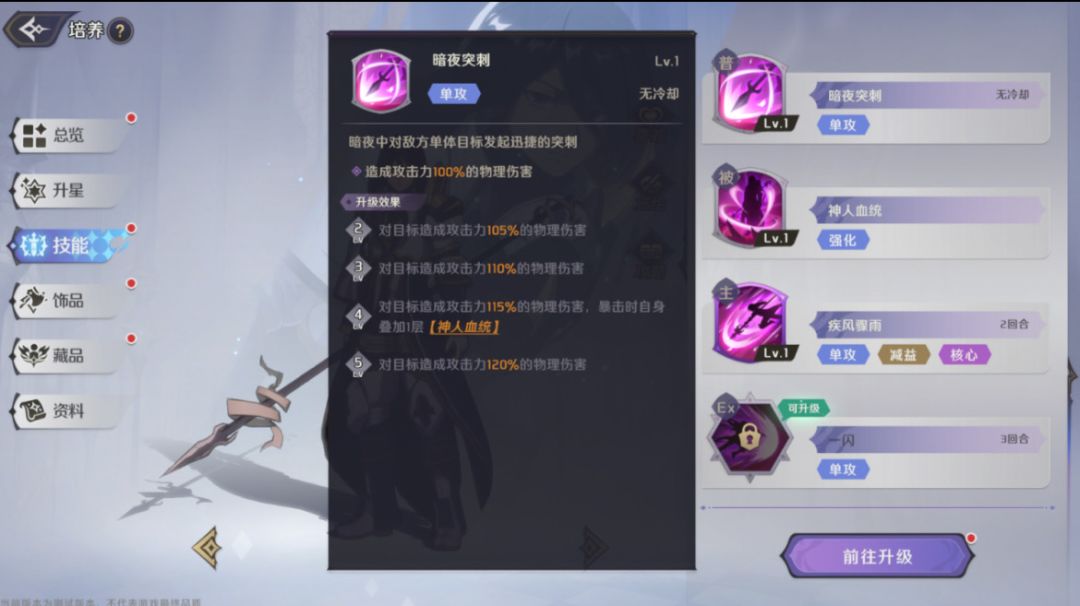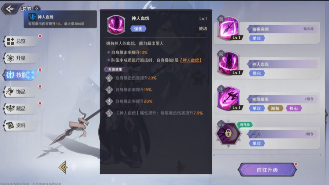 单体伤害技能,无冷却,技能等级4级时,会在暴击后叠加1层【神人血统】。