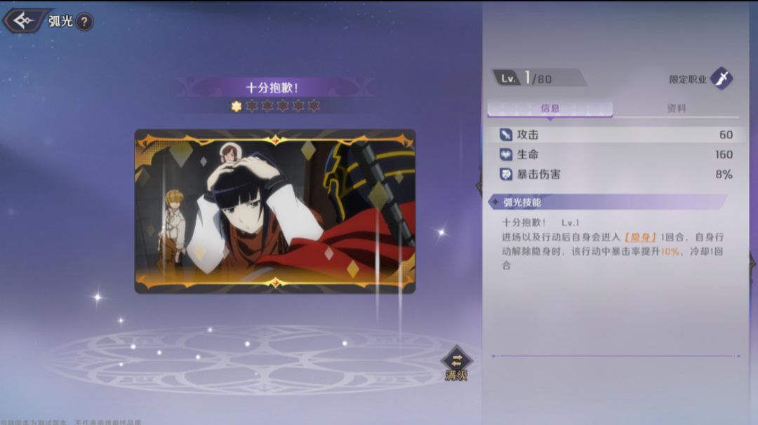 重点推荐【十分抱歉】,进场以及行动后进入【隐身】状态,无法被点选,受到伤害降低20%,行动解除隐身时,提高10%暴击率。该弧光可以很好的提高漆黑盛典第一席的生存能力,避免其开场即遭到对方集火秒杀,同时提供了暴击率,使其爆发输出更加稳定。