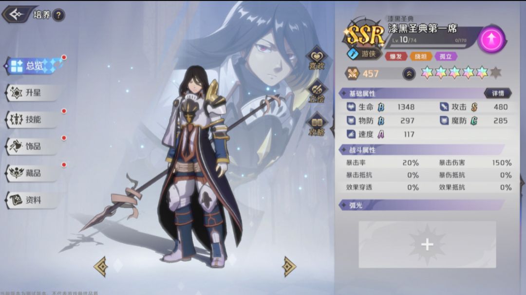 总体上来说,漆黑盛典第一席是一个比较偏后期的刺客型角色,需要拥有较高的面板攻击力、较高的技能等级,才能发挥出最大的作用,尤其适合竞技场作战。所以,获得了漆黑盛典第一席的至尊们,可以根据自身情况将其培养起来,作为竞技场杀手来使用哦。