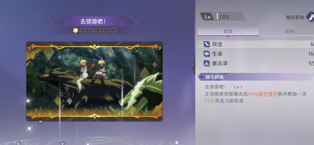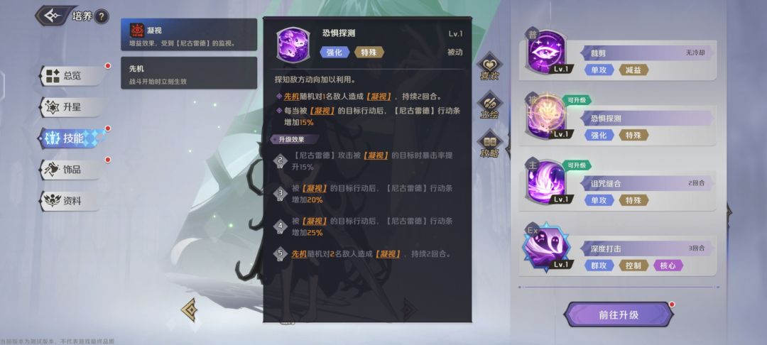 先机对随机一个敌人释放【凝视】,同时被【凝视】的目标行动时,尼古雷德的行动条会增加15%。到2级时尼古雷德攻击被【凝视】目标时暴击率会提升15%。后续升级技能会提升先机释放【凝视】的人数,也会提升尼古雷德增加的行动条。