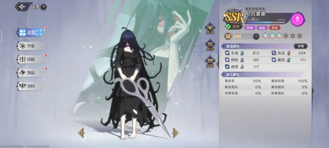 尼古雷德是初始为SSR的角色,职业为游侠,定位为控制类型角色,擅长控制,减益。所属阵营为苍翠绿,角色面板中速度为A,攻击为S,其他属性都在及格线。
