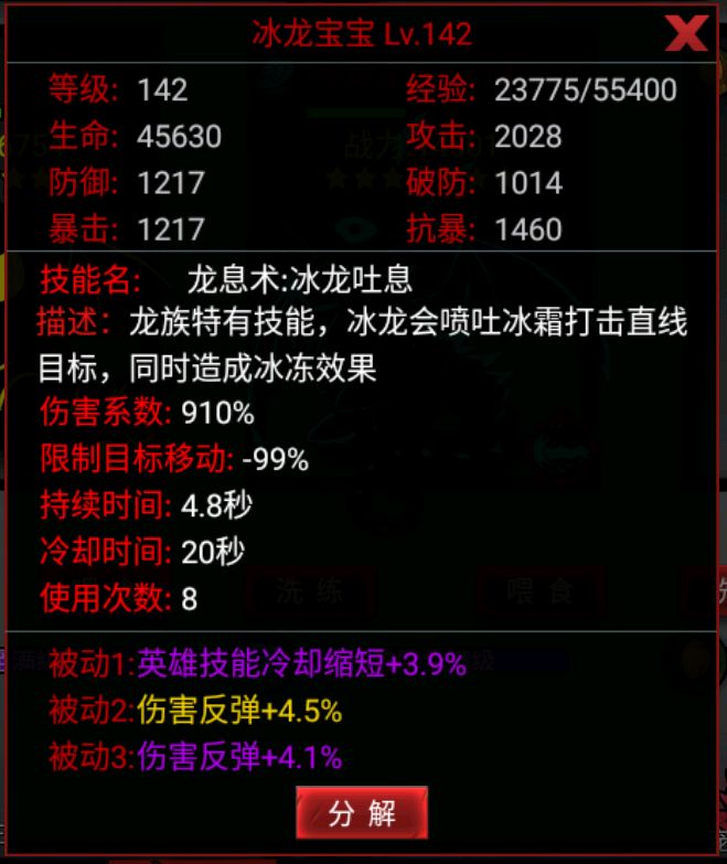 3.冰龙宝宝,属性水,技能:对前方射出一道龙息并造成伤害,同时禁锢敌方单位,持续4.8秒(满星4.8秒),冷却20秒,次数最高8次(满星8次)