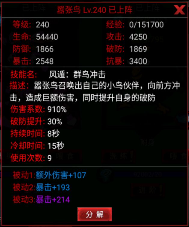 28.嚣张鸟,属性风,技能:召唤鸟群攻击敌人造成伤害同时提高自身最高30%破防(满星30%)。持续8秒,冷却15秒,使用次数9次(满星9次)。