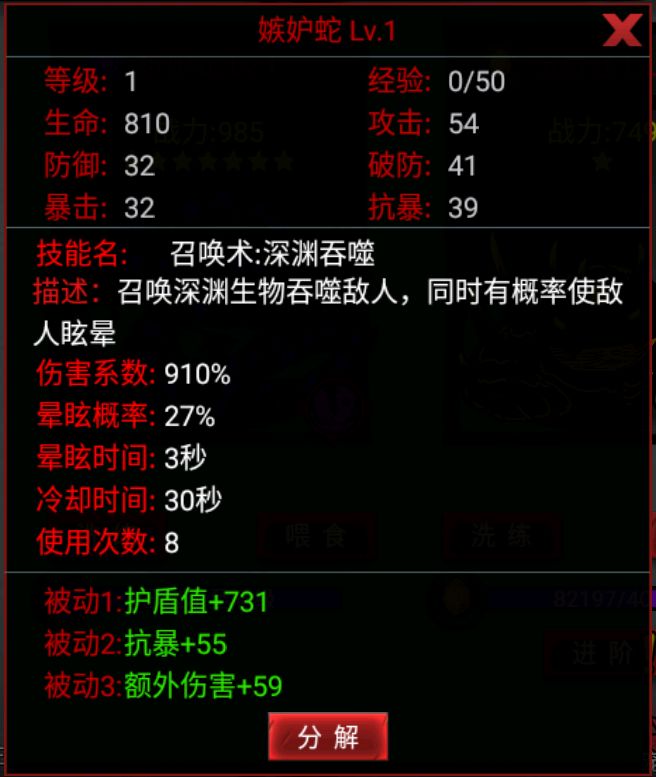 15.嫉妒蛇,属性暗,技能:召唤嫉妒蛇缠绕敌人造成伤害同时有27%(满星27%)概率眩晕对手3秒(满星3秒),冷却30秒,使用次数8次(满星8次)。