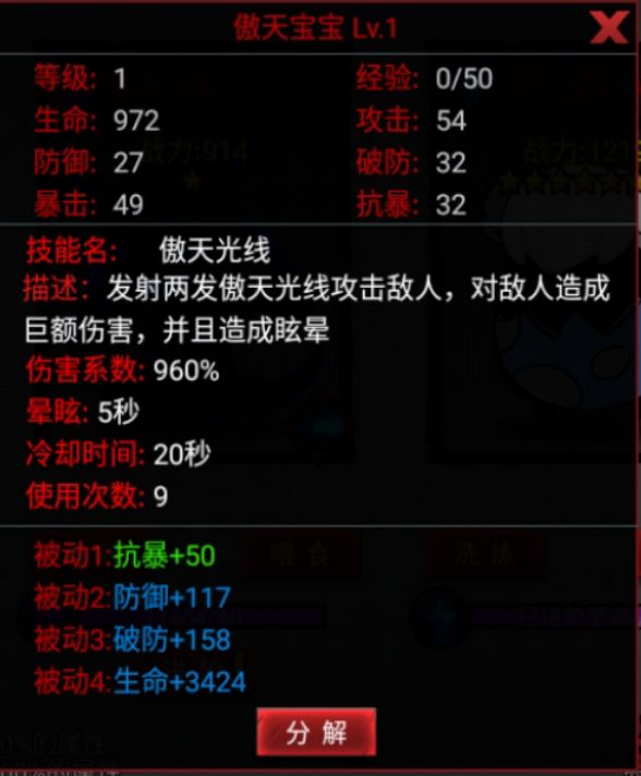 16.傲天宝宝,属性雷,技能:发射光线攻击敌人造成伤害并眩晕对手最高5秒(满星5秒),冷却20秒,使用次数8次(满星8次)。