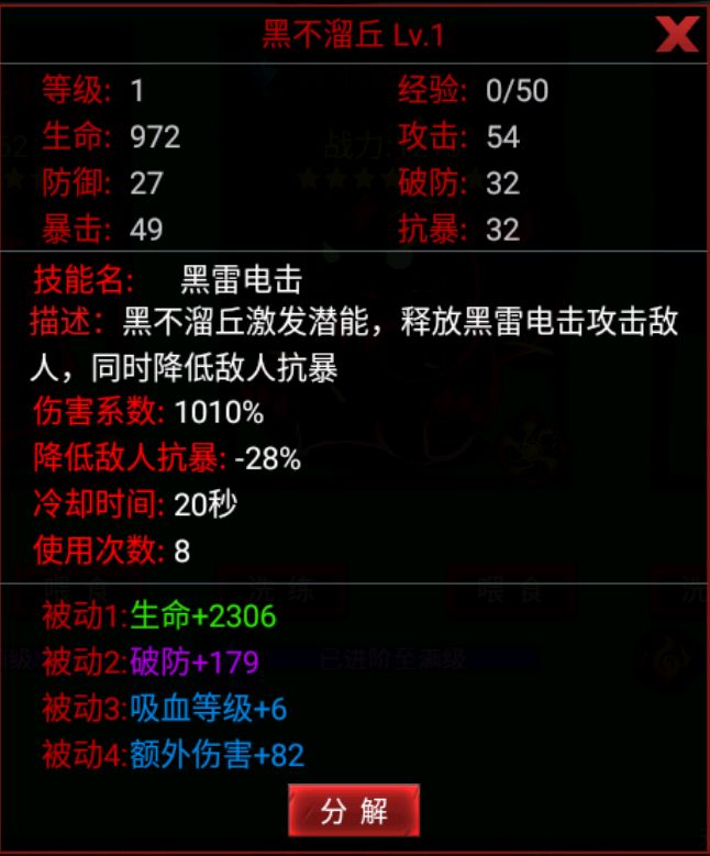 18.黑不溜丘,属性雷,技能:召唤黑不溜丘释放雷电造成伤害的同时降低敌人抗暴最高28%(满星28%)抗暴,冷却时间20秒,使用次数8次(最高8次)。