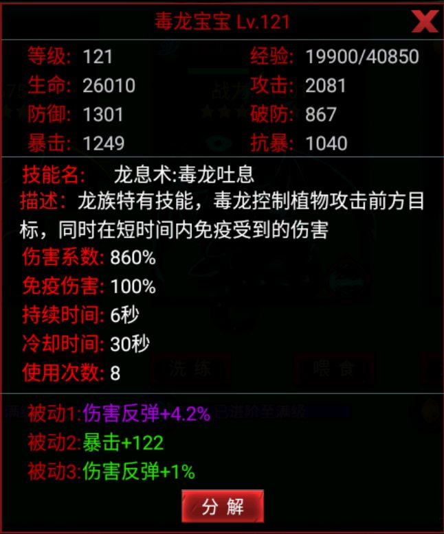 4.毒龙宝宝,属性土,技能:对前方射出一道龙息并造成伤害,同时免疫自身伤害,持续6秒(满星6秒),冷却30秒,次数最高8次(满星8次)