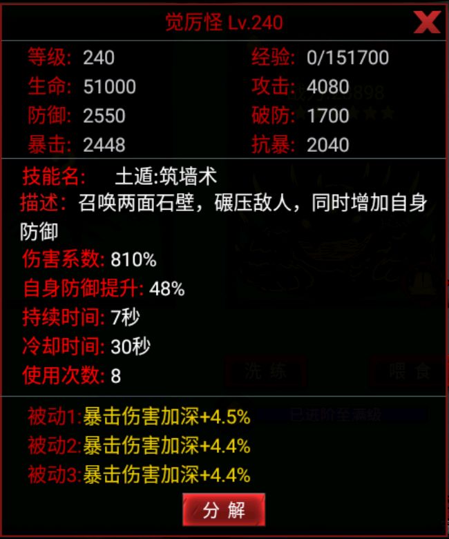10.觉厉怪,属性土,技能:召唤两只土墙碾压敌人(可使魔王产生位移)造成伤害同时增加自身最高48%防御(满星48%),持续时间7秒,冷却30秒,使用次数8次(满星8次)。