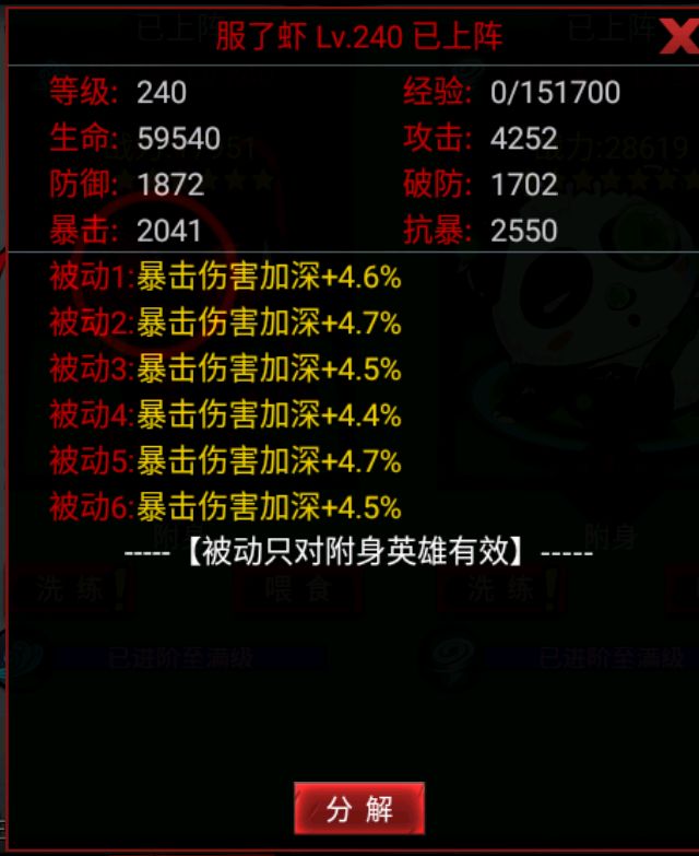 23.熊猫宝宝,属性风,技能:向前方产生一道冲击波和竹林突刺,造成伤害同时降低敌人最高45%防御(满星45%),持续时间8秒,冷却15秒,使用次数9次(满星9次)。